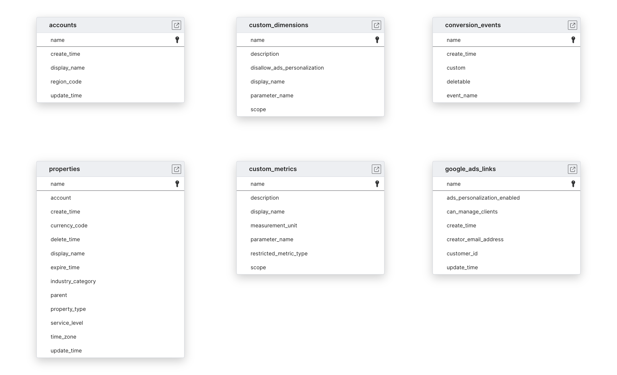 The connector also syncs metadata from the Google Analytics Admin API:
