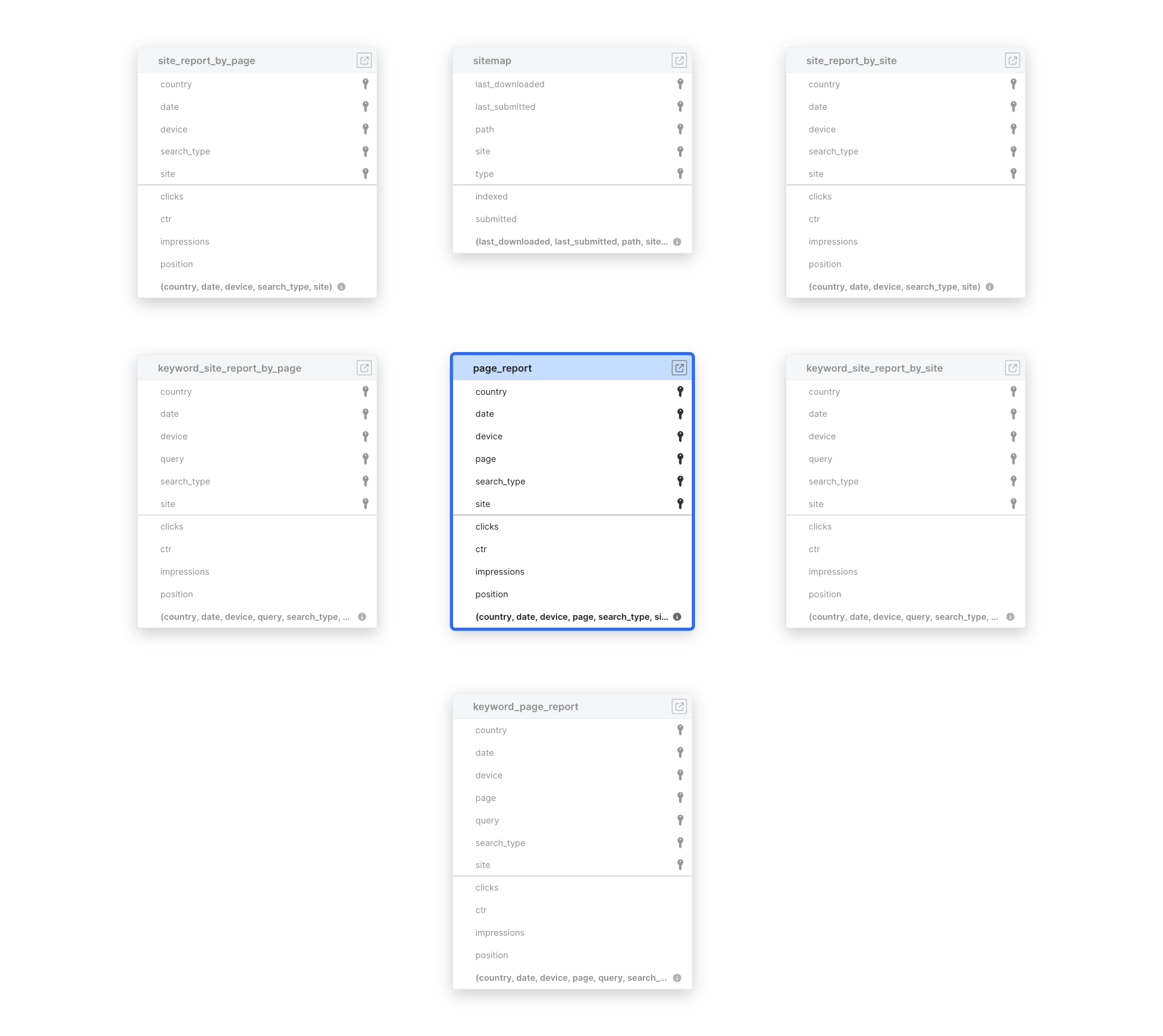PAGE_REPORT: Search traffic data for the pages of the site. Each record shows how a particular page on the site appeared in the search result on a particular day and its corresponding metrics. Dimensions include:
