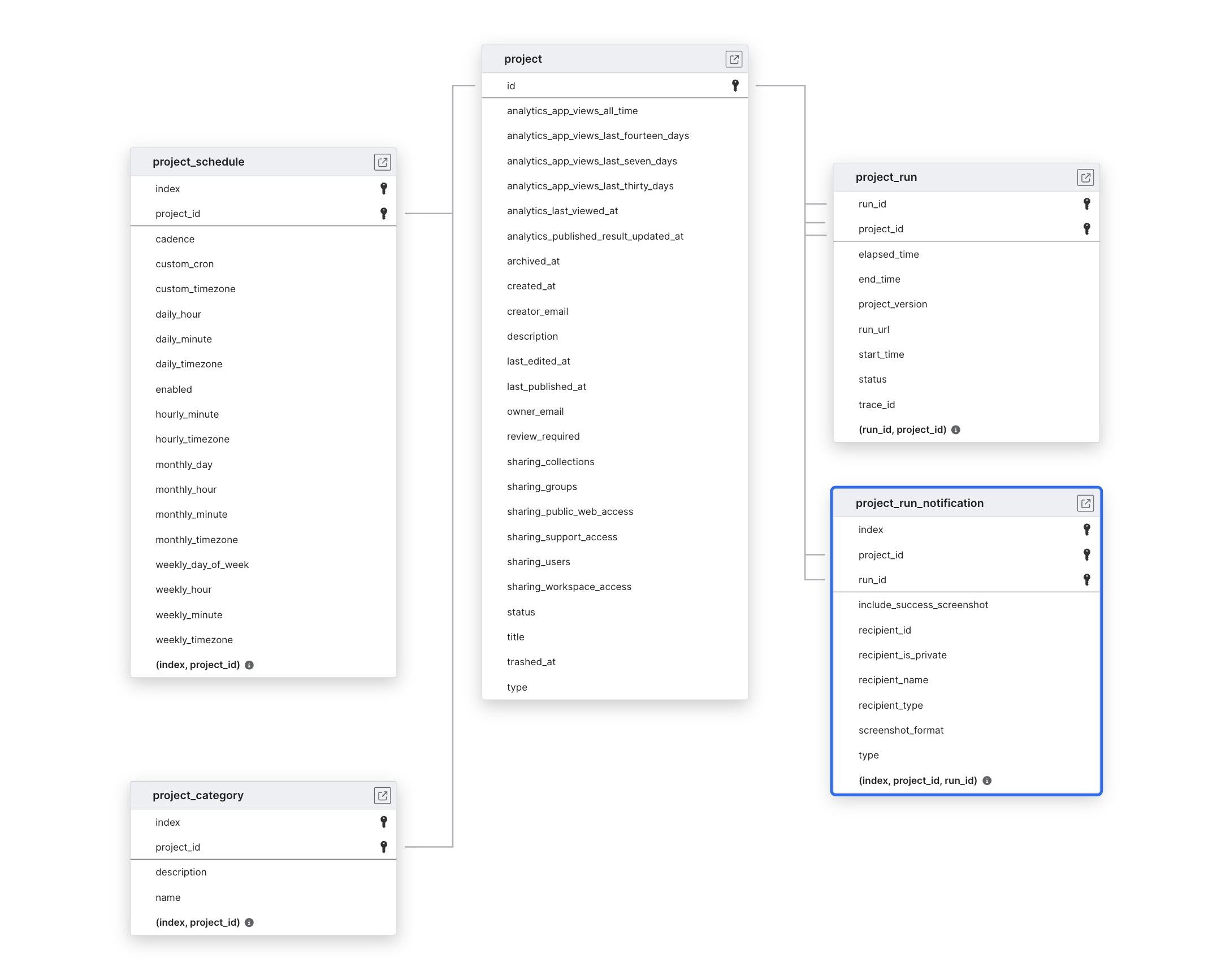 To capture new records, updates, and deletes, we incrementally sync the PROJECT table and its child tables.