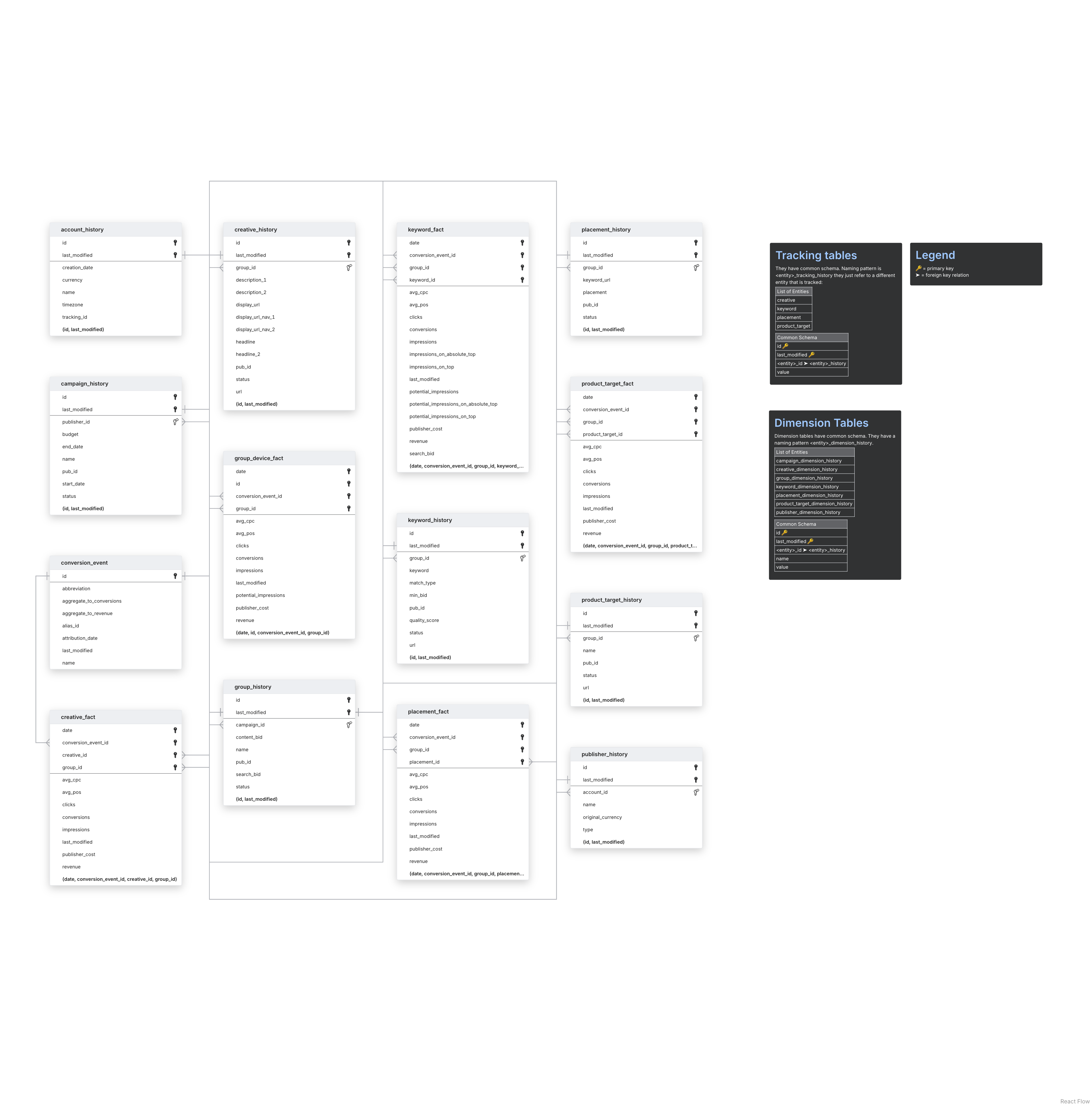 Fact tables have daily metrics (impressions, clicks, conversions, etc.). KEYWORD_FACT, CREATIVE_FACT, PLACEMENT_FACT, PRODUCT_TARGET_FACT and GROUP_DEVICE_FACT are the fact tables.
