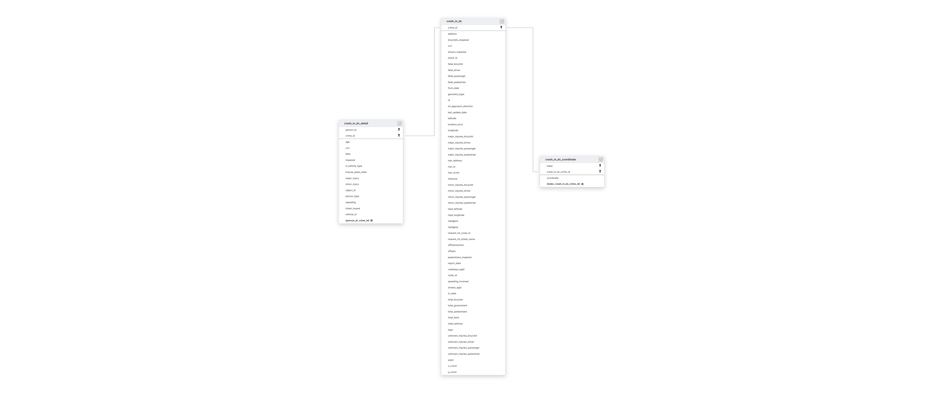 The connector syncs data for the Crashes In DC dataset into your destination. To capture new records, we incrementally sync the CRASH_IN_DC table and its child tables.