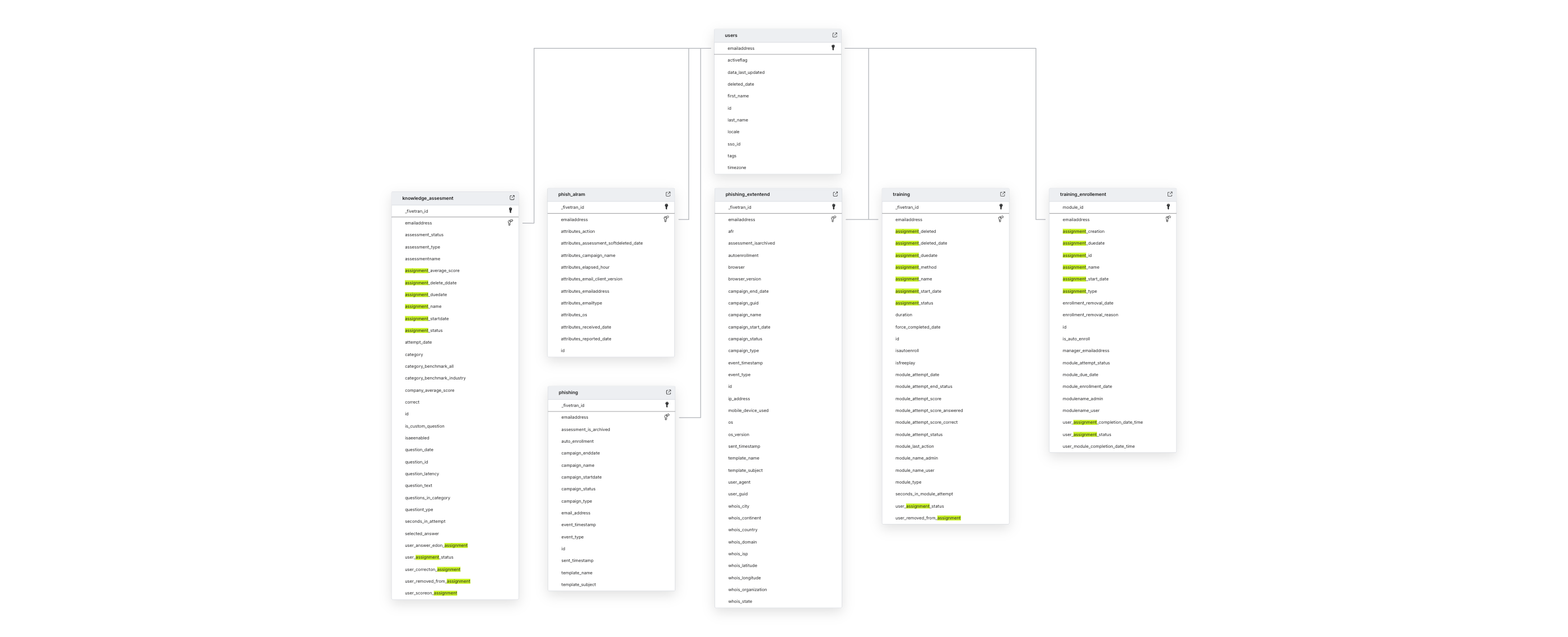 KNOWLEDGE_ASSESSMENTPHISH_ALARMPHISHINGPHISHING_EXTENDEDTRAININGTRAINING_ENROLLMENTUSERS