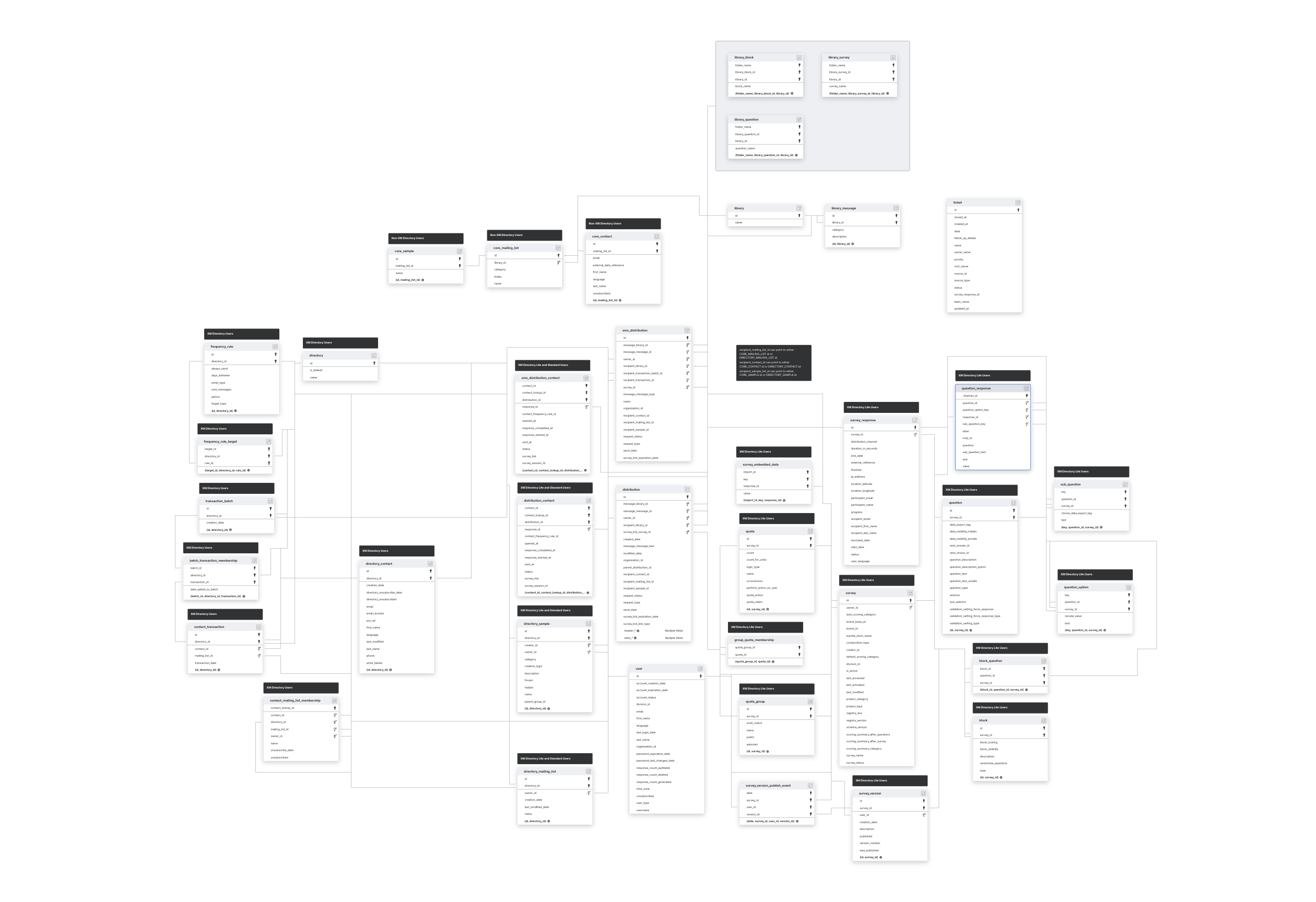 If you use XM Directory, we do not sync the Non-XM Directory Users tables shown in the ERD. If you don't use XM Directory, we do not sync the XM Directory Users and XM Directory Lite Users tables shown in the ERD.