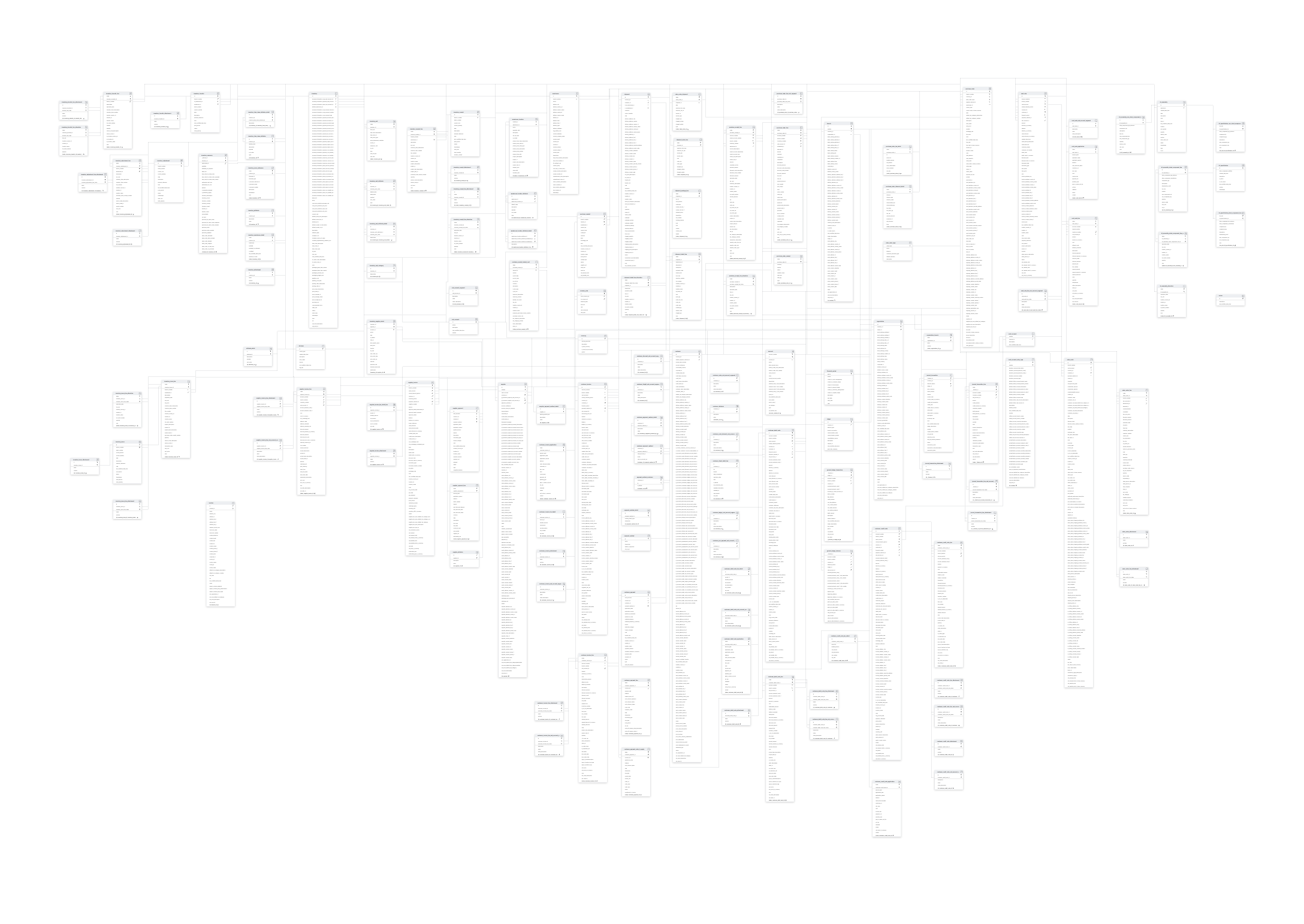 ATTRIBUTEACCOUNTBRANCHCARRIERCASH_ACCOUNTCASH_SALECURRENCY_RATECUSTOMERCUSTOMER_CREDIT_NOTECUSTOMER_DEBIT_NOTECUSTOMER_INVOICECUSTOMER_PAYMENTGENERAL_LEDGER_BALANCEGENERAL_LEDGER_TRANSACTIONINVENTORYINVENTORY_ADJUSTMENTINVENTORY_ISSUEINVENTORY_RECEIPTINVENTORY_TRANSFERKIT_ASSEMBLYKIT_SPECIFICATIONLEDGERLOCATIONORGANIZATIONPAYMENT_METHODPURCHASE_ORDERPURCHASE_RECEIPTSALE_ORDERSALES_ORDER_TYPESHIPMENTSUB_ACCOUNTSUPPLIERSUPPLIER_INVOICESUPPLIER_PAYMENT
