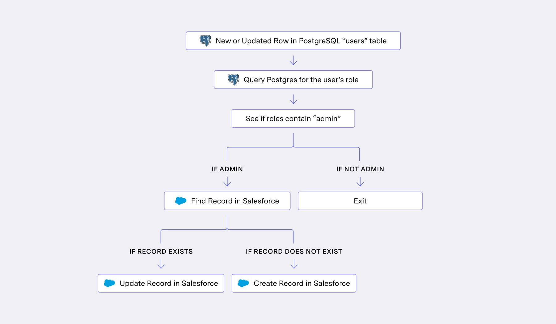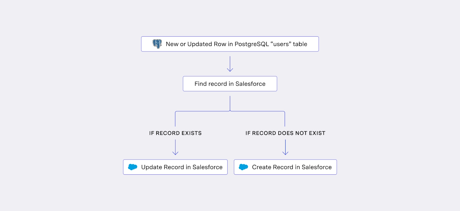 In the above workflow, each processed record must query your Postgres once, make an API call to Salesforce to look up the record, then make another API call to Salesforce to create or update the record.