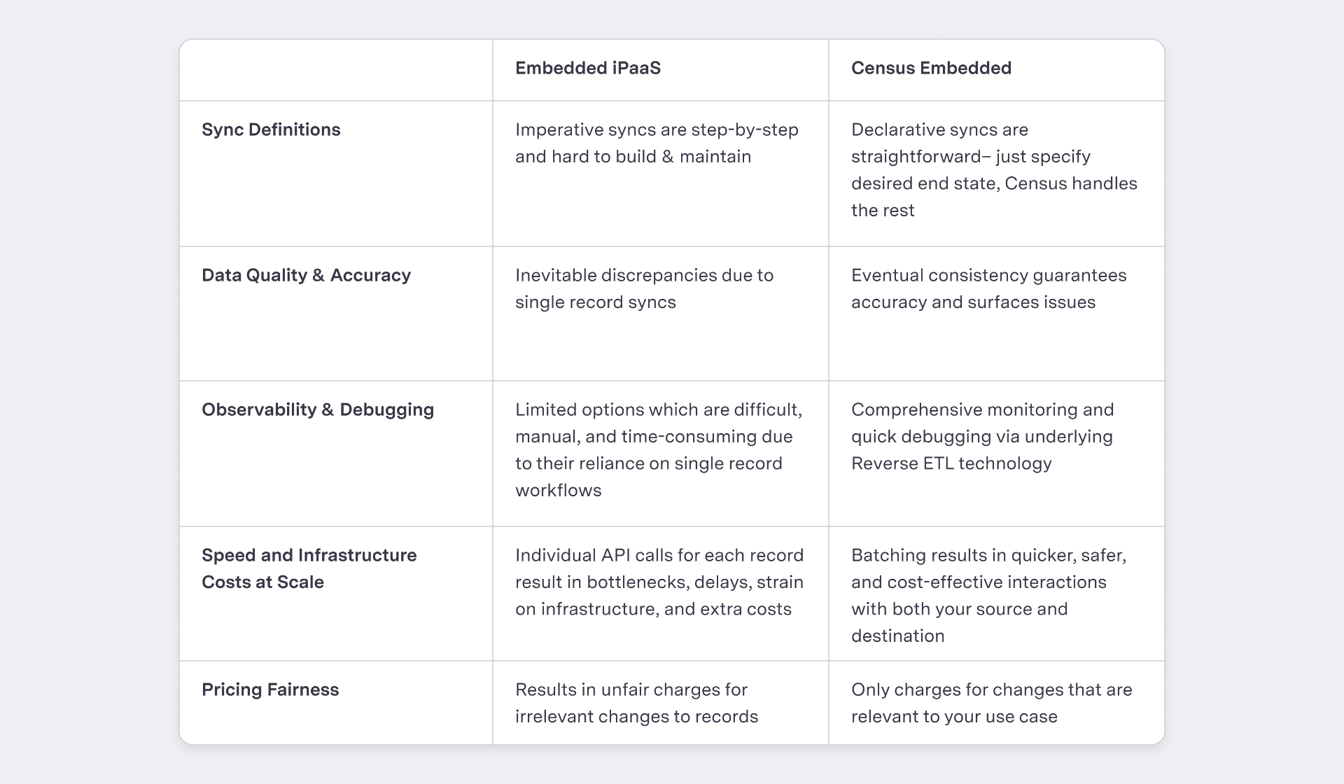 In an Embedded context, this can lead to debilitating pain. Data discrepancies can lead to significant customer frustration and support overhead, and are a non-starter for your business. With iPaaS, you’re resigning to data drift between your source and destination, and missing data over time. Customer support tickets can lead to long debugging investigations and loss of trust in your business. It’s a problem that only grows in scale over time, and the impact on your business is extremely painful.
