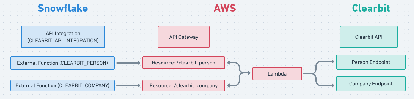 Once the API Integration and external functions are created, assuming that the backing gateway is configured properly and our Lambda that forwards requests to Clearbit's API is implemented properly, we should be able to call them like any other SQL function: