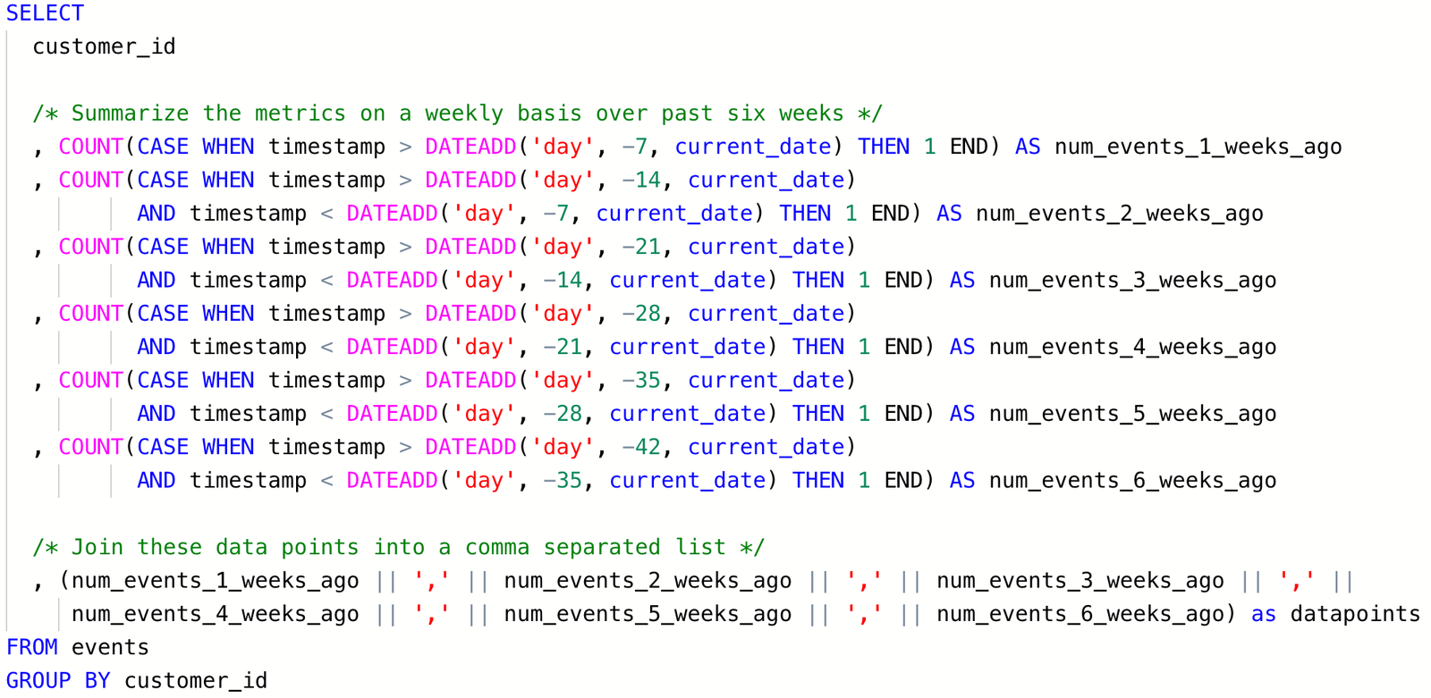 Here I’m calculating the datapoints over the last six weeks and then I join them into a comma separated list. That’s the value we’re going push into Salesforce that we’ll use for our sparkline, you’ll see why it’s a comma separated list in a minute. My last step is to take this new datapoint and push it into a text field in Salesforce.
