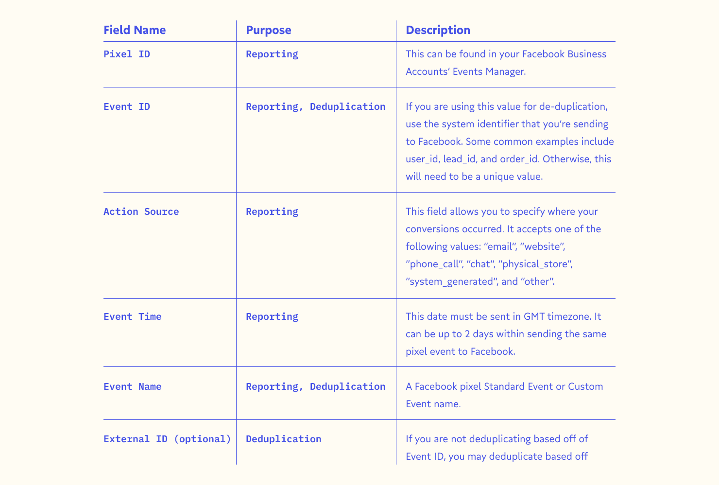 - Deduplication. If sending this conversion data via the pixel as well, Facebook can deduplicate the conversions, provided that the data sent via API is within two days of the pixel tracking the conversion event.