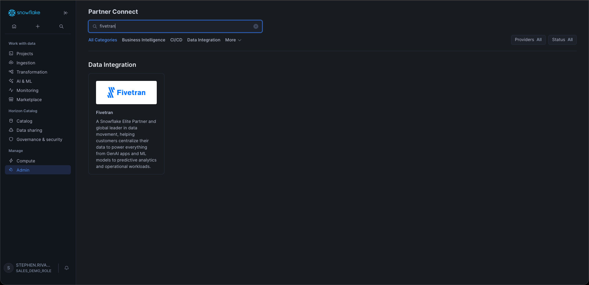 Step 2: Under Admin, select Partner Connect and search for Fivetran.