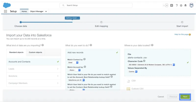 As I mentioned previously, data loader allows you to import records of 50,000 up to 5,000,000. If you’re importing less records than that, you might consider the next method, Salesforce Data Import Wizard.