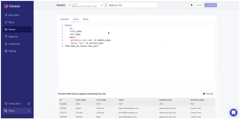 - Give your model a name (ex. “Test Model”). If you’d like to preview your query, click preview. Otherwise, click save model. Here’s an example of creating a model in Fivetran Activations: