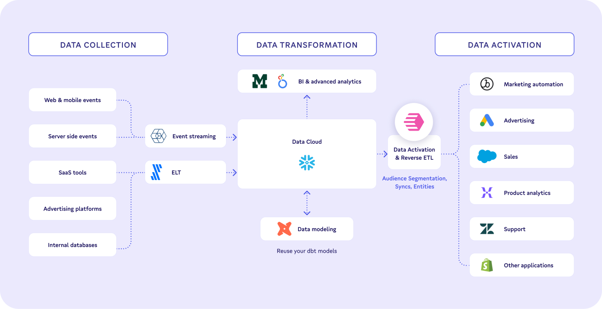 To avoid creating separate data silos in a traditional CDP, organizations began leveraging Fivetran Activations to activate customer data directly from Snowflake. With the addition of other best-in-class components like Fivetran for ELT, dbt for data transformation, and Snowplow for event collection, a more robust marketing platform — the Composable CDP — was born.
