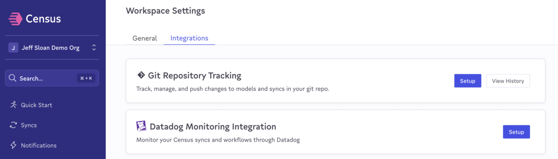 To enable, head to your workspaces's Settings > Integrations page, and click "Setup" for Git Repository Tracking. For more details, please visit our docs.\