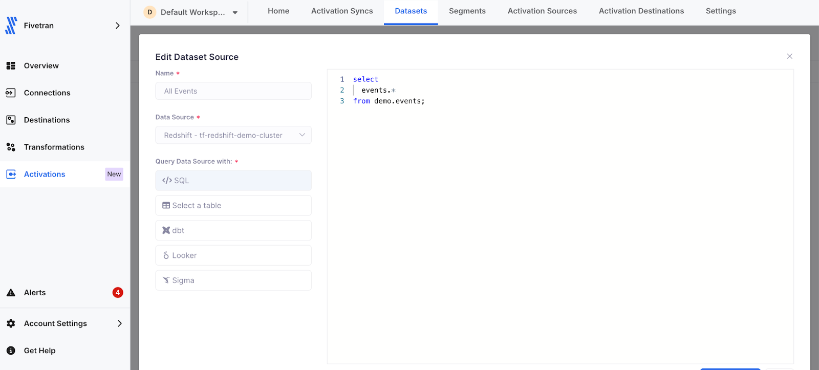 - Create the dataset you want to activate within Datasets. You can create a dataset using SQL, selecting a table from within the source you already configured, or using one of our integrations with dbt, Looker, or Sigma. You can also create Mesh Datasets that help you combine data across sources to create more complex and robust data activations. Or, you can manually upload CSV files with data. These Datasets are then available to you when you configure your Syncs.