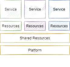 On top of the infrastructure, you build or operate a platform (such as Kubernetes) to simplify and uniformize IT operations. At the intermediary level are several shared services, like CI/CD machines, monitoring tools, and code and artifact repositories that are split into many different services – each with its own databases, caches, and queues as backing resources.