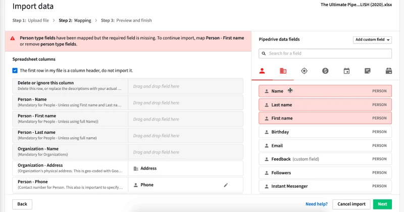 - To properly import your data into Pipedrive, you should map the fields in your file to those in the existing data destination by dragging and dropping the fields on the right side (existing Pipedrive fields) into the Spreadsheet columns (new data fields from your file).