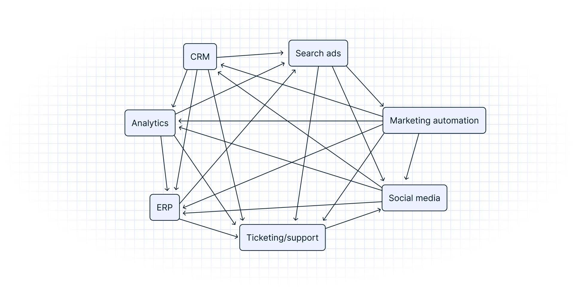 Rebuilding point-to-point integrations around a central data repository vastly simplifies your data architecture and workflows (especially transformations) by consolidating a huge number of point-to-point pipelines into a much smaller number of one-to-many pipelines. You can reuse the same models to sync data to your operational tools, and you don’t have to start from scratch every time you want to build a new data pipeline.