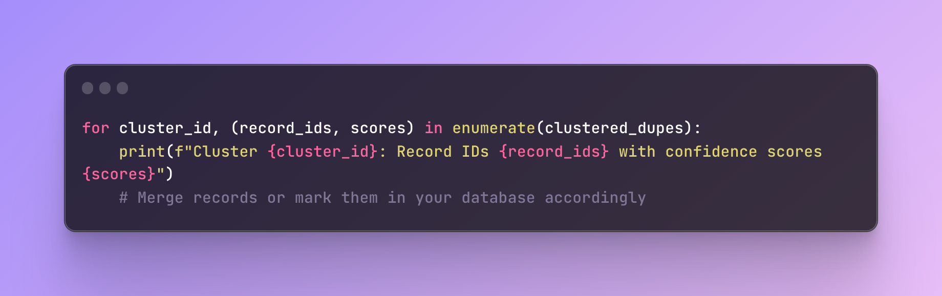 The output from Dedupe includes clusters of records identified as duplicates with confidence scores. These clusters allow us to: