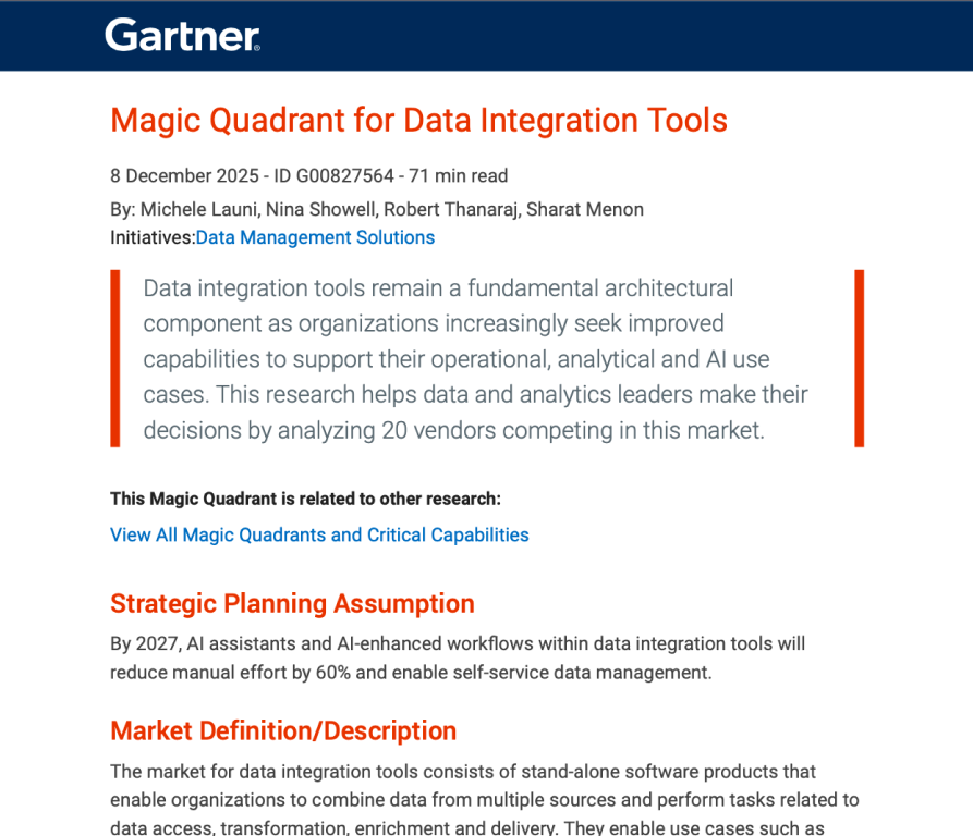 Gartner, Magic Quadrant for Data Integration Tools, Michele Launi, Nina Showell, Robert Thanaraj, Sharat Menon, 8 December 2025.